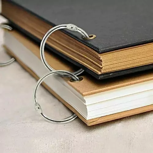 Argola articulada com trava que abre e fecha, utilizada para scrapbook, cartonagem e encadernação.
