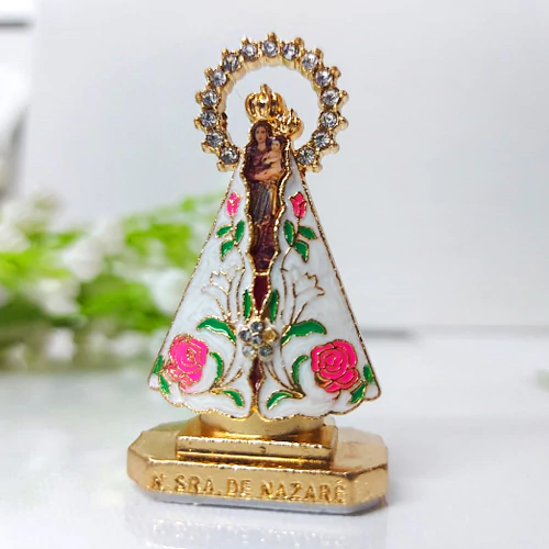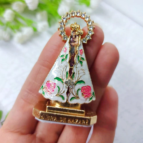 Este delicado enfeite de metal traz a imagem de Nossa Senhora de Nazaré, com um acabamento detalhado em seu manto branco, que é adornado com rosas.