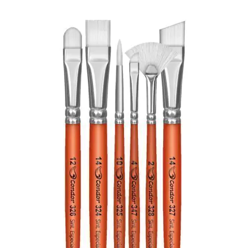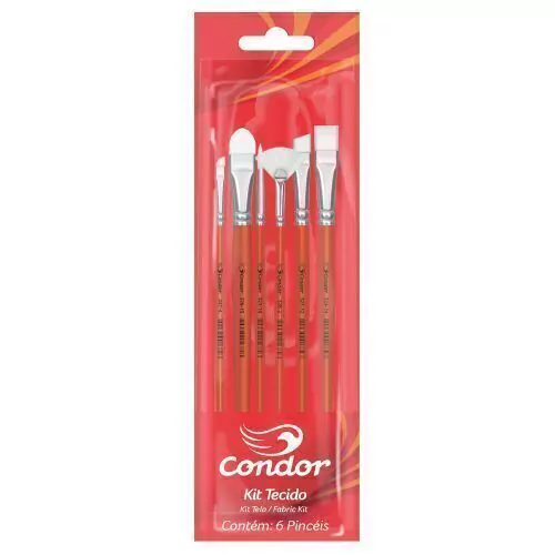 Kit ideal para pintura em tecidos. Os Pincéis do Kit fazem parte da linha Sintética Especial da Condor, possuem cabo curto de madeira, com vários formatos que facilitaram os trabalhos de pintura com equilíbrio e conforto ganhando mais agilidade nas pinceladas.